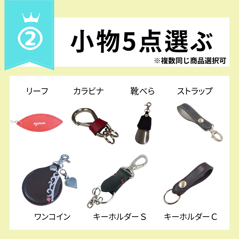 リーフ、カラビナ、靴べら、ストラップ、ワンコインキーホルダー、キーホルダーS、キーホルダーCからご自由にお選びください。(同商品を複数選ぶことも可能です)